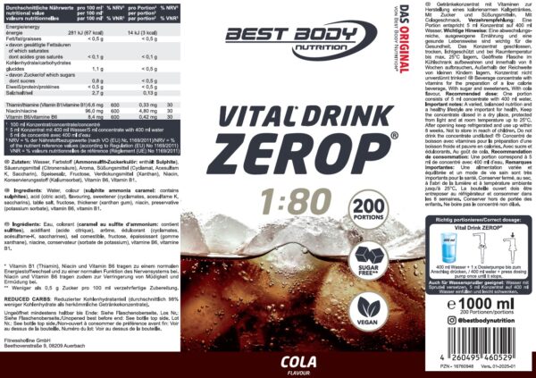 Best Body Nutrition Vital Drink Getränkekonzentrat 1:80 Cola 1000 ml Sirup mit Fruchtsaft2 durchschnittlich nur 2,5 kcal pro Portion3 zuckerfrei4…
