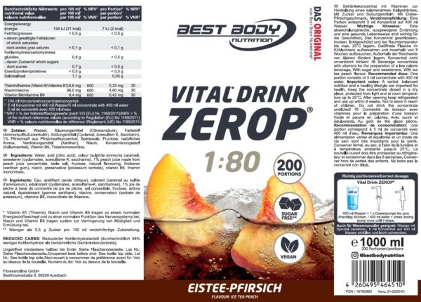 Best Body Nutrition Vital Drink Getränkekonzentrat 1:80 Eistee Pfirsich 1000 ml Sirup mit Fruchtsaft2 durchschnittlich nur 2,5 kcal pro Portion3…