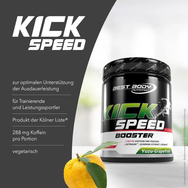 Der Professional Kick Speed Booster von Best Body Nutrition ist der ultimative Pre-Workout-Booster für ein effektives Training mit klarem Fokus und maximaler Leistungsfähigkeit. Durch die optimal aufeinander abgestimmten Komponenten wird der Metabolismus unterstützt und somit die körperliche Leistungsfähigkeit positiv beeinflusst, um auch in der intensivsten Trainingseinheit fokussiert und konzentriert durchzustarten. Das Vitamin B1 spielt hierbei eine wichtige Rolle bei der Erhaltung eines normalen Energiestoffwechsels***. Das Vitamin B2 trägt zur Verringerung von Müdigkeit und Ermüdung bei****. Der Kick Speed Booster wird mit dem patentierten Markenrohstoff AstraGinTM abgerundet. Für mehr Informationen zum Rohstoff verweisen wir auf die Herstellerseite, welche im untenstehenden Link aufgeführt ist.