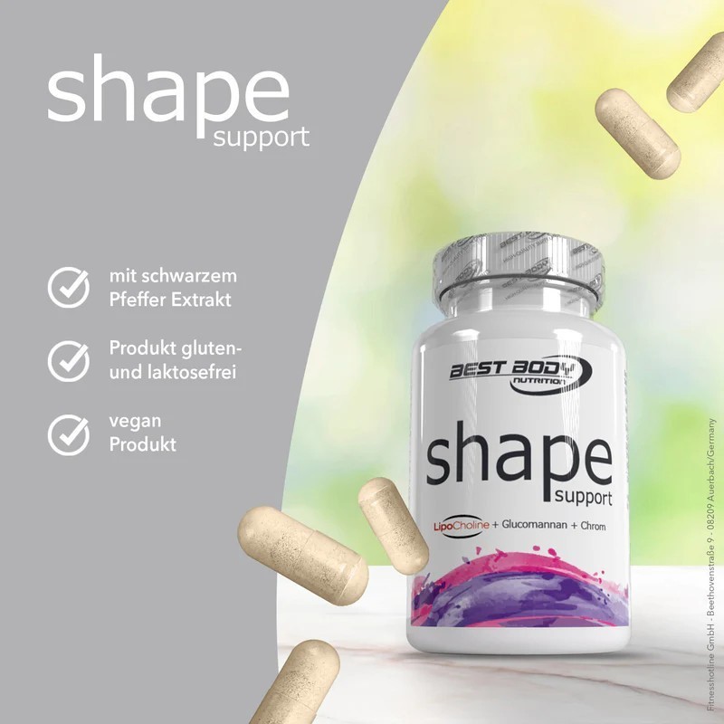 Best Body Nutrition Shape Support, Nahrungsergänzungsmittel mit Glucomannan, Austernpilzpulver, Cordyceps Sinensis Extrakt, Cholin, Schwarzer Pfefferextrakt und Chrom.