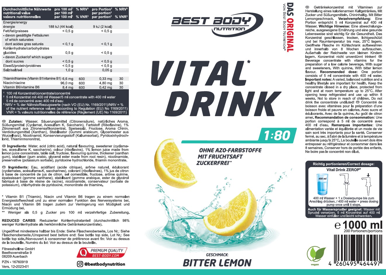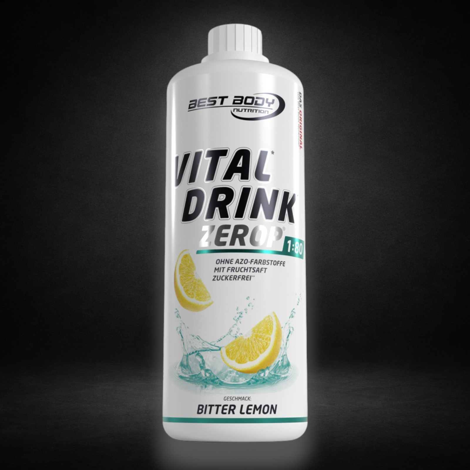 Best Body Nutrition Vital1 Drink ZEROP®, Getränkekonzentrat mit Vitaminen zur Herstellung eines kalorienarmen Kaltgetränkes. Mit Zucker und Süßungsmitteln. Chininhaltig. Mit Bitter Lemongeschmack.