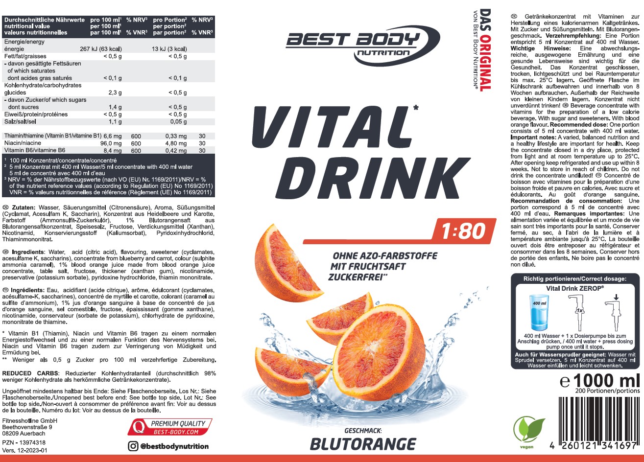 Best Body Nutrition Vital1 Drink ZEROP®, Getränkekonzentrat mit Vitaminen zur Herstellung eines kalorienarmen Kaltgetränkes. Mit Zucker und Süßungsmitteln. Mit Blutorangengeschmack.