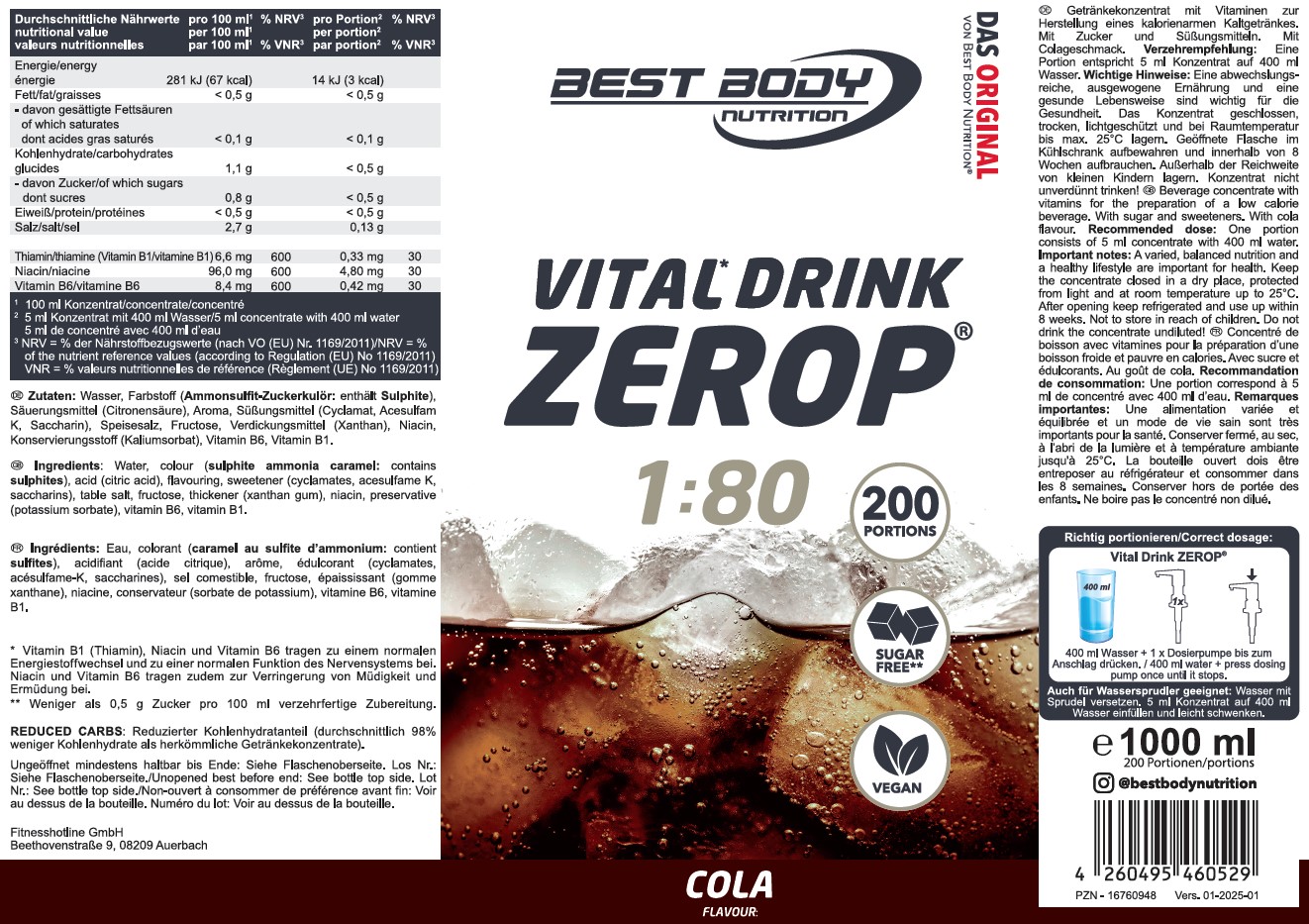 Best Body Nutrition Vital1 Drink ZEROP®, Getränkekonzentrat mit Vitaminen zur Herstellung eines kalorienarmen Kaltgetränkes. Mit Zucker und Süßungsmitteln. Mit Kirsch-Colageschmack.