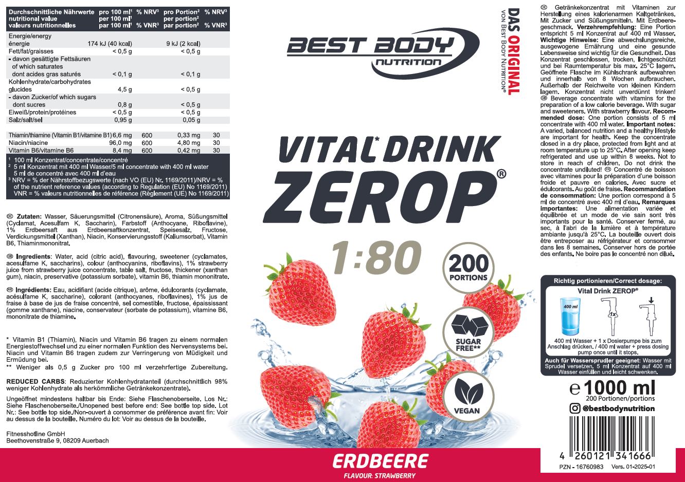 Best Body Nutrition Vital1 Drink ZEROP®, Getränkekonzentrat mit Vitaminen zur Herstellung eines kalorienarmen Kaltgetränkes. Mit Zucker und Süßungsmitteln. Mit Erdbeergeschmack.