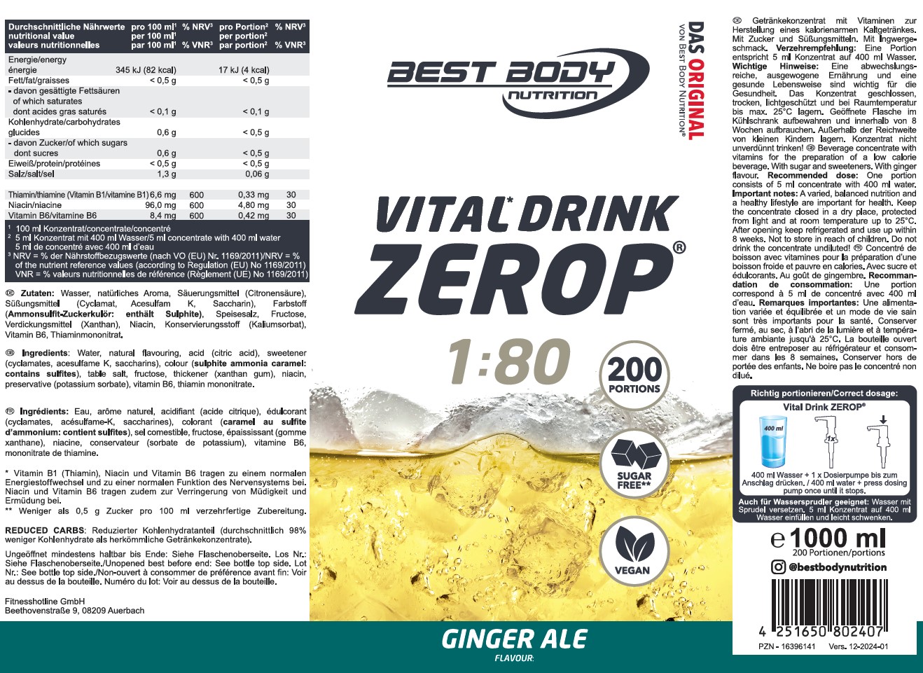 Mit dem Vital1 Drink ZEROP® von Best Body Nutrition kann in Sekundenschnelle ein kohlenhydratreduziertes, zuckerfreies3 Getränk hergestellt werden. Im Vergleich zu herkömmlichen Getränkekonzentraten weist er einen um durchschnittlich 98 % geringeren Kohlenhydratanteil auf. Der erfrischende Ginger Ale Geschmack ist ein besonderes Highlight.