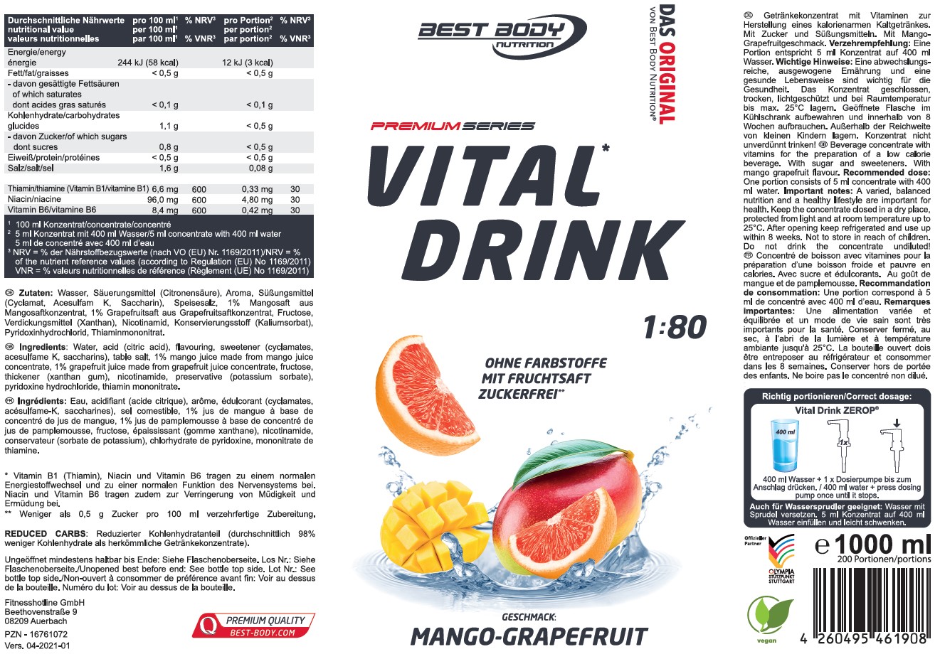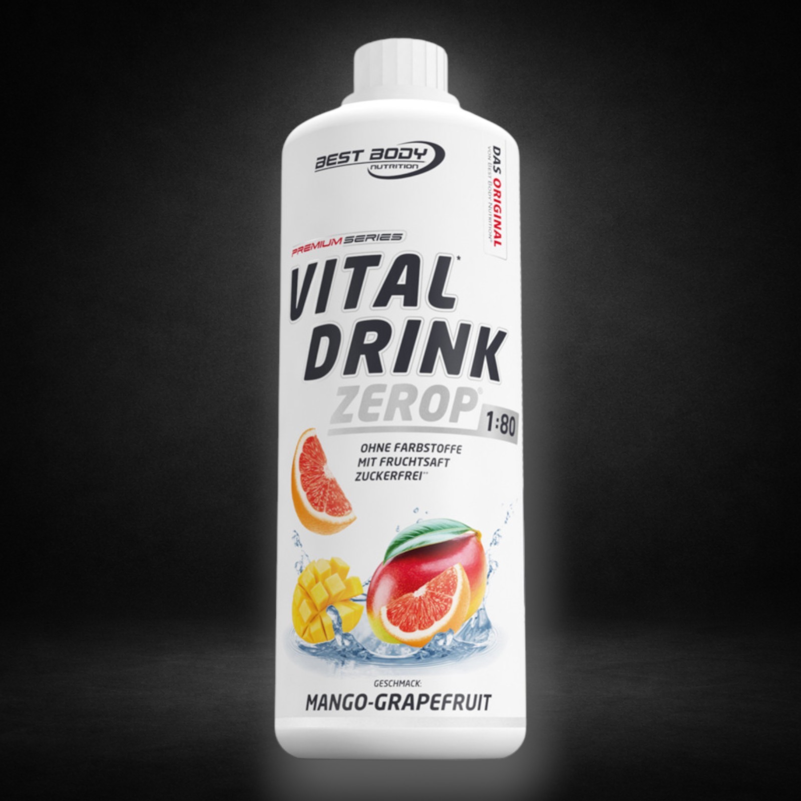 Best Body Nutrition Vital1 Drink ZEROP®, Getränkekonzentrat mit Vitaminen zur Herstellung eines kalorienarmen Kaltgetränkes. Mit Zucker und Süßungsmitteln. Mit Mango-Grapefruitgeschmack.