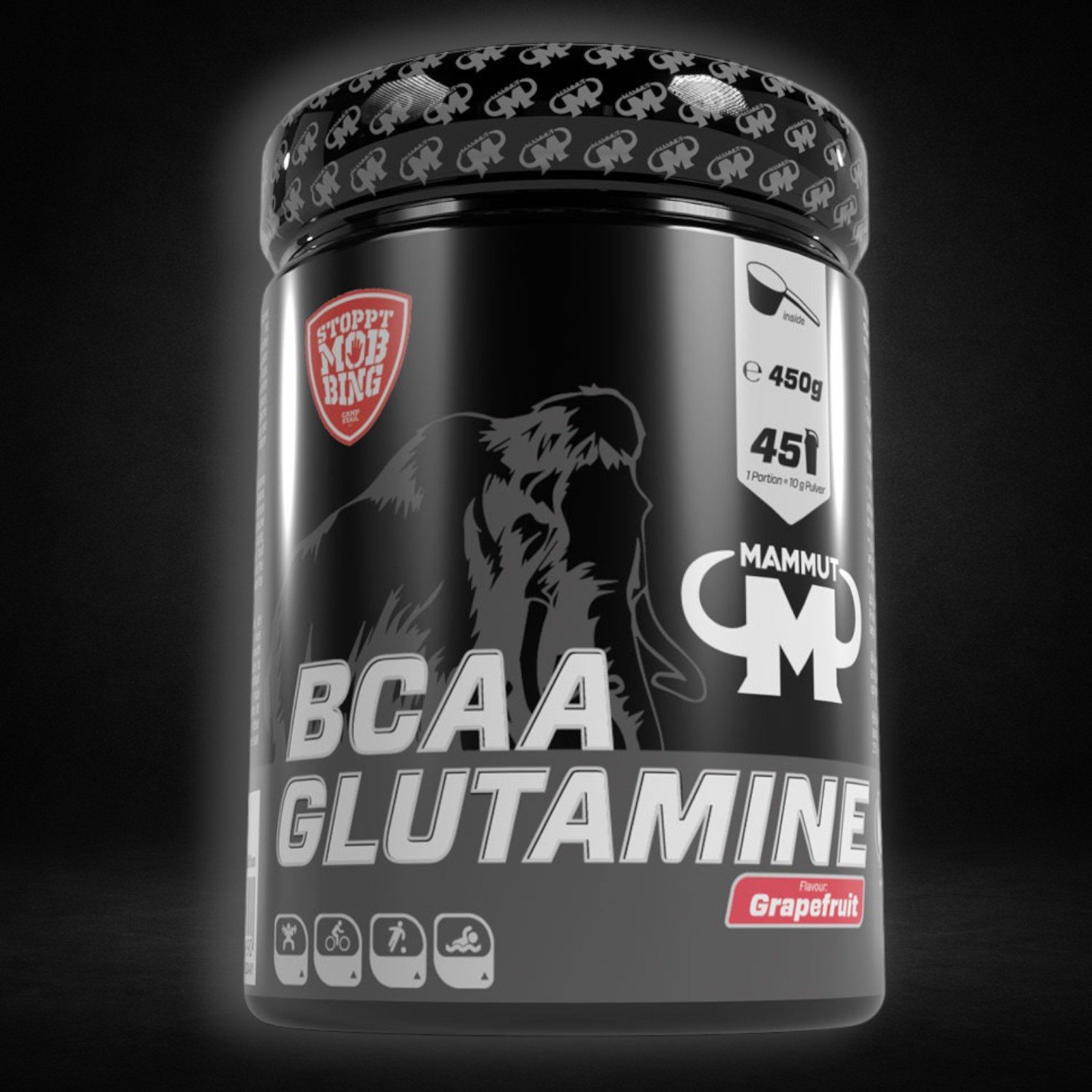 Mammut BCAA Glutamine Powder, Nahrungsergänzungsmittel mit L-Glutamin, verzweigtkettigen Aminosäuren (BCAA) L-Leucin, L-Valin, L-Isoleucin und Vitamin C. Mit Süßungsmitteln. Mit Grapefruitgeschmack.