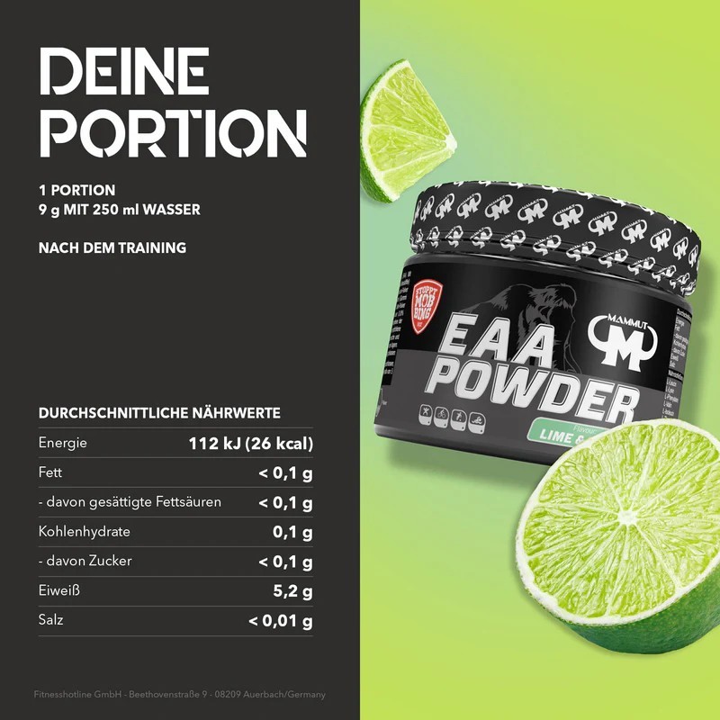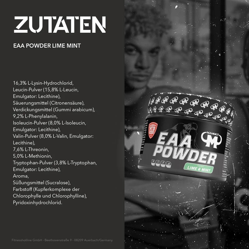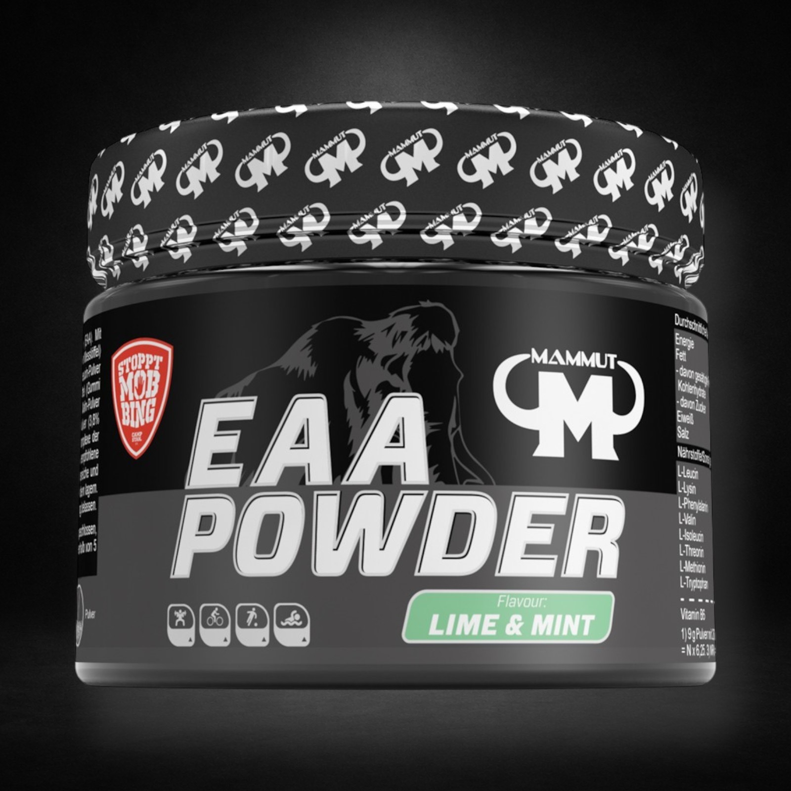 Mammut EAA Powder, Nahrungsergänzungsmittel mit 74% essentiellen Aminosäuren (EAA). Mit Süßungsmitteln. Mit Limette-Minze-Geschmack.